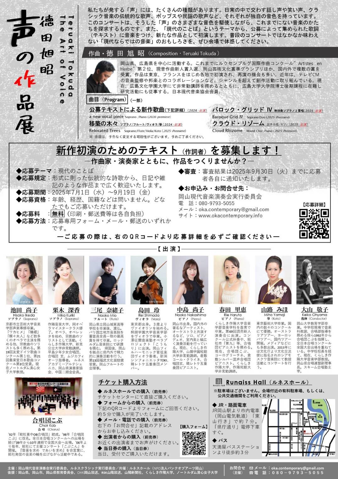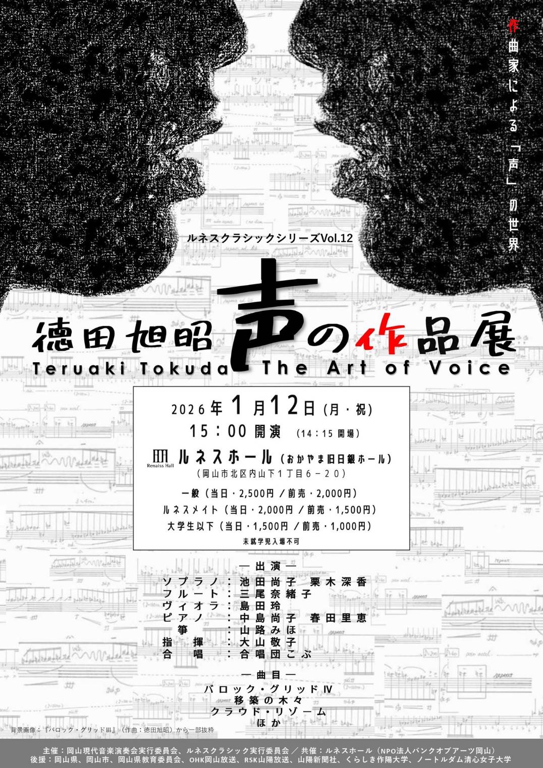 合唱団こぶ 出演 徳田旭昭 声の作品展 2026年1月12日(月・祝) 15:00開演 ルネスホール(岡山市北区) 一般(当日2,500円・前売2,000円) ルネスメイト(当日2,000円・前売1,500円) 大学生以下(当日1,500円・前売1,000円) |