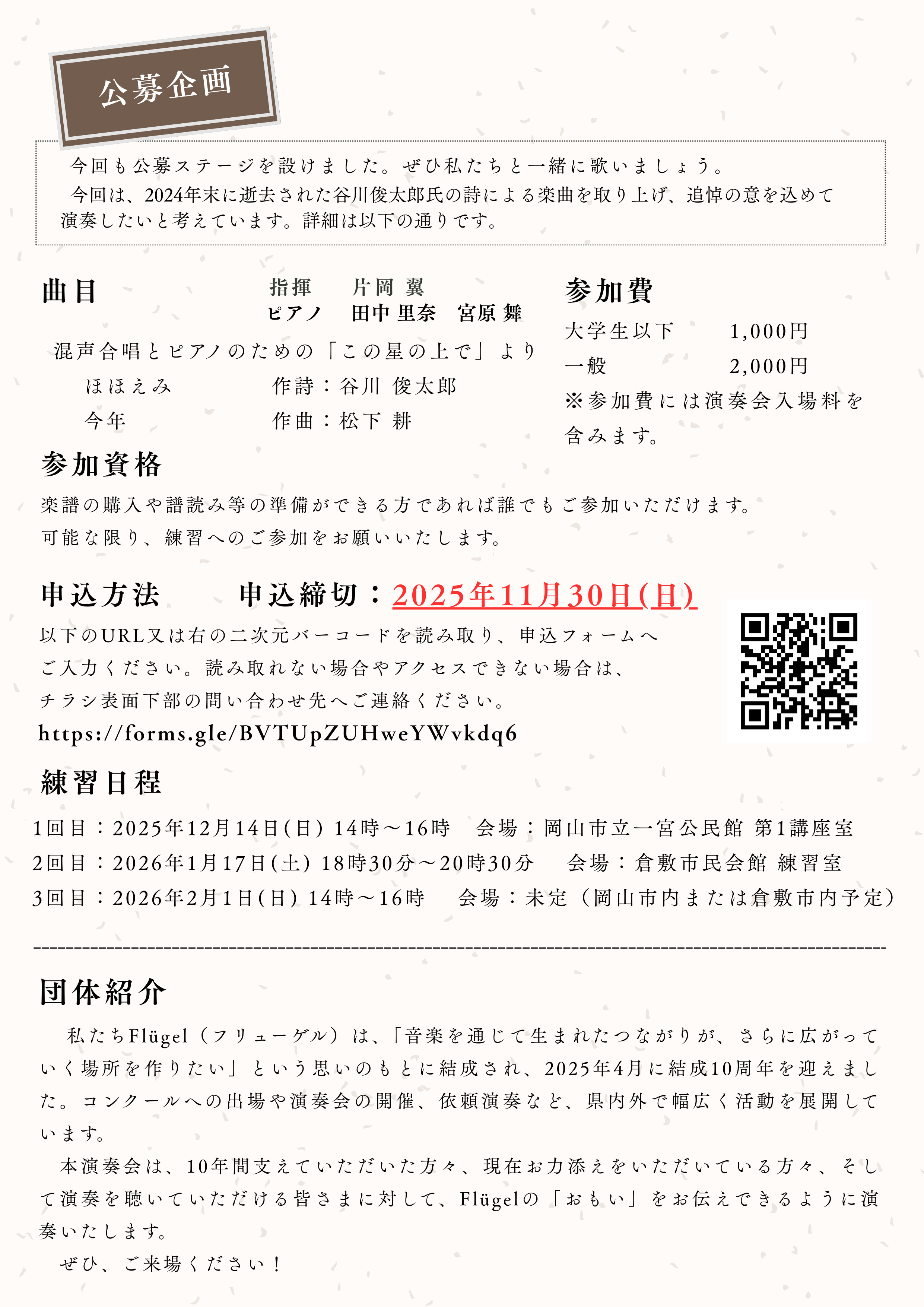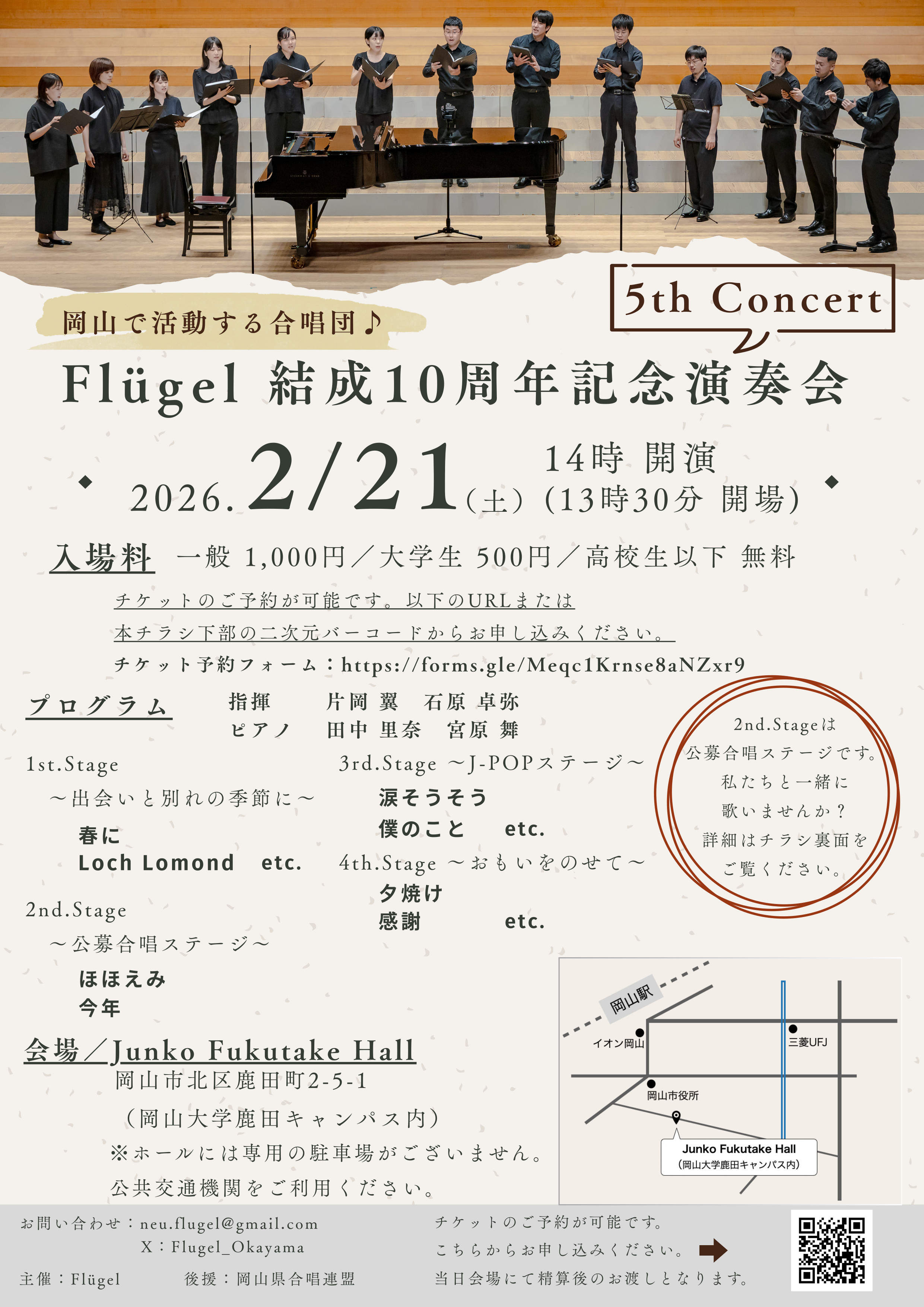 Flügel 結成10周年記念演奏会 2026年2月21日(土) 14:00開演 Junko Fukutake Hall(岡山市) 入場 一般 1,000円/大学生 500円/高校生以下 無料 |