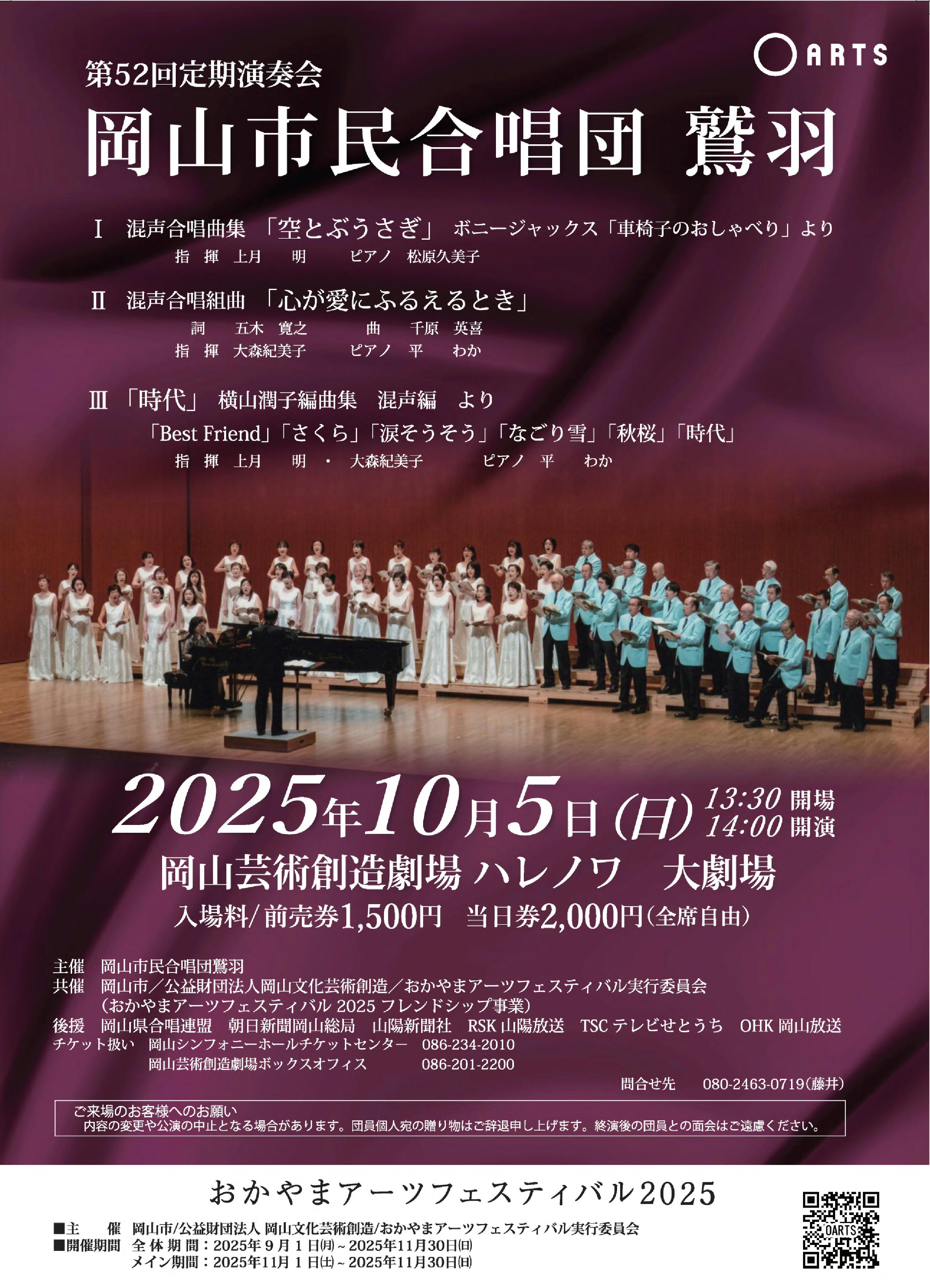 岡山市民合唱団 鷲羽 第52回定期演奏会 2025年10月5日(日) 14:00開演 岡山芸術創造劇場ハレノワ 大劇場 前売1,500円・当日2,000円 |
